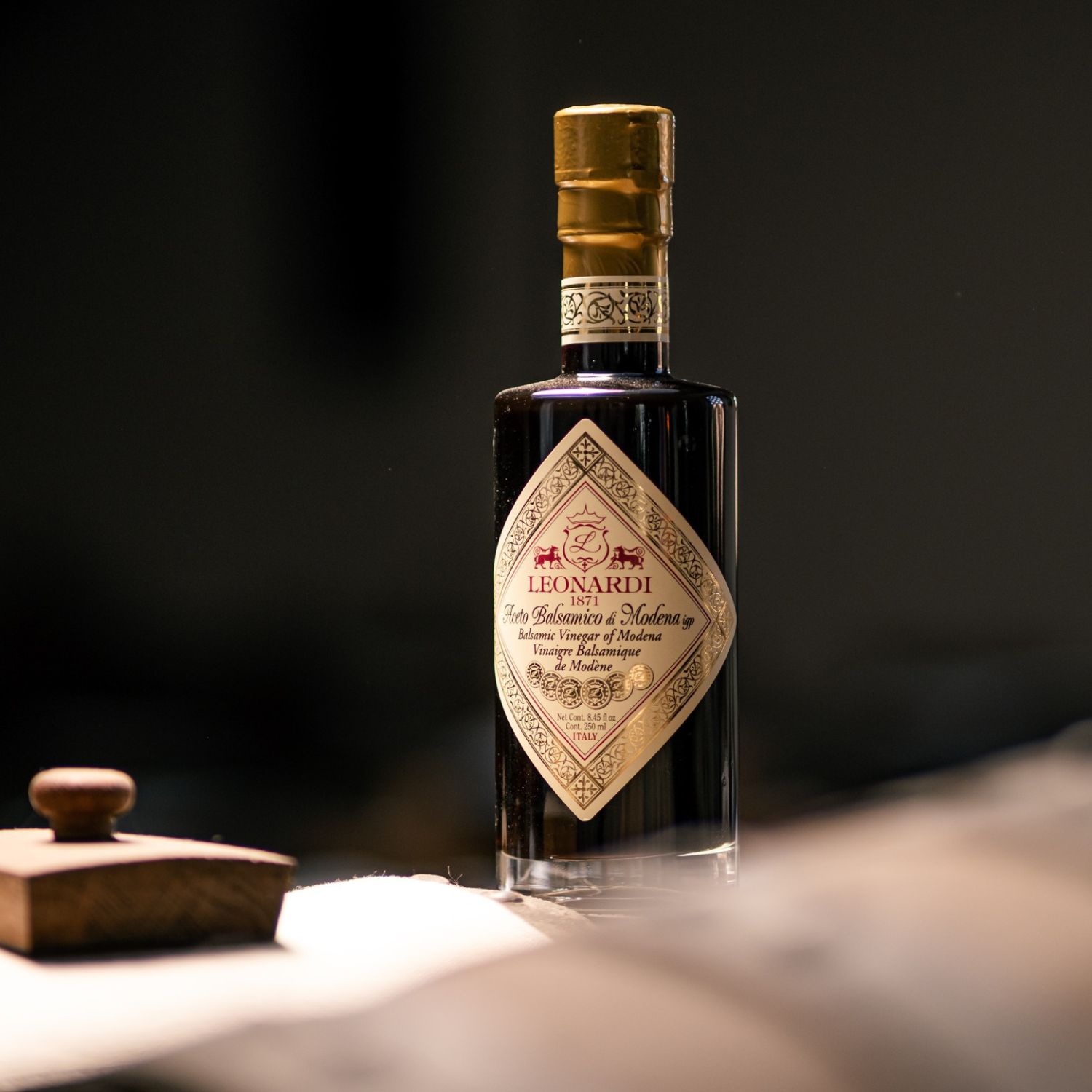 Vinaigre balsamique de Modène affiné en fûts de bois nobles, la signature Leonardi allie richesse aromatique, densité et élégance.